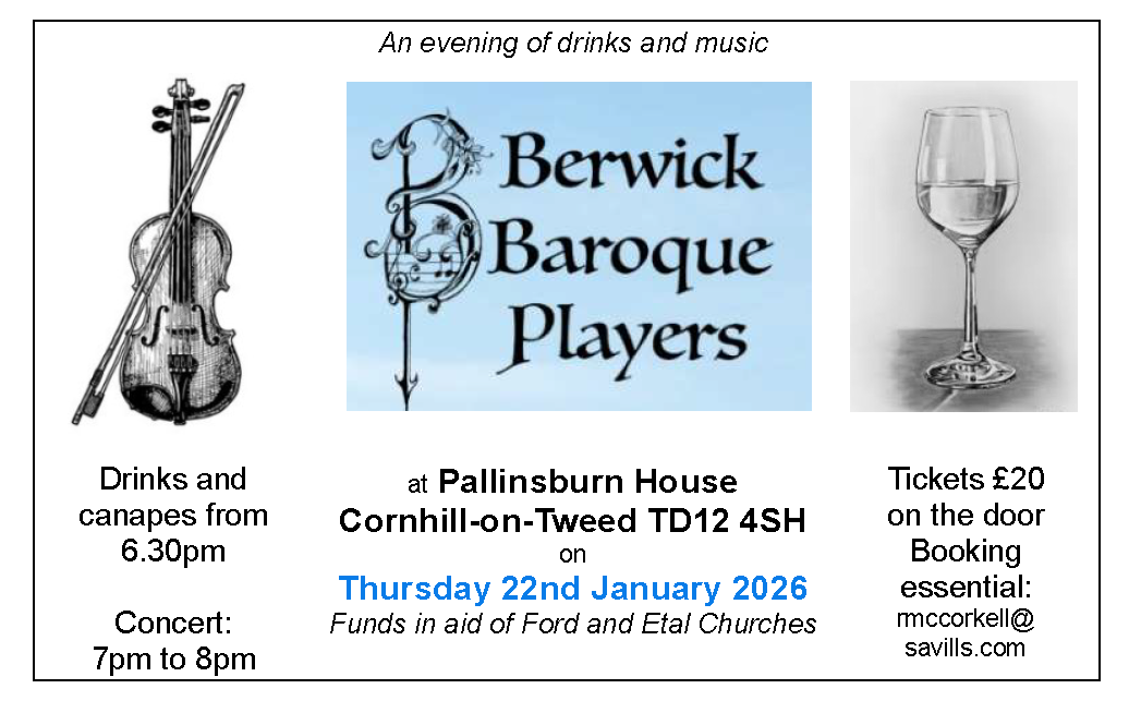 The Berwick Baroque Players are performing at the Pallinsburn House Concert on Thursday 22nd January 2026. The event starts at 6.30pm with drinks and canapés in the ballroom. The 7pm to 8pm concert takes place in the library and the programme includes excerpts from Handel’s Water Music and Music for the Royal Fireworks, Boismortier’s Concerto a Cinq and Corelli’s Pastorale. Pallinsburn House is a Grade II* listed 18th-century country house situated at Crookham, Northumberland. Tickets are £20 on the door. Advance booking is essential. Email rmccorkell@savills.com. Funds in aid of Ford and Etal churches.